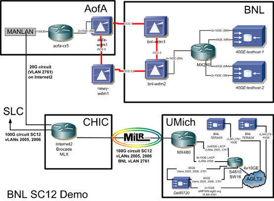 Diagram of Umich and BNL site configuration on MiLR and Internet2 for SC12.